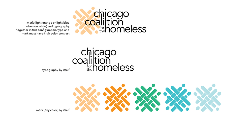 This identity redesign was for the Chicago Coalition for the Homeless, a non-profit organization advocating for people in Chicago experiencing or at risk of homelessness. They specialize in community work and behind the scenes legal activism. The final mark was developed with community and togetherness in mind. A breathable color palette and the interwoven nature of the mark aim to imply a sense of support and hopefulness for the future.
